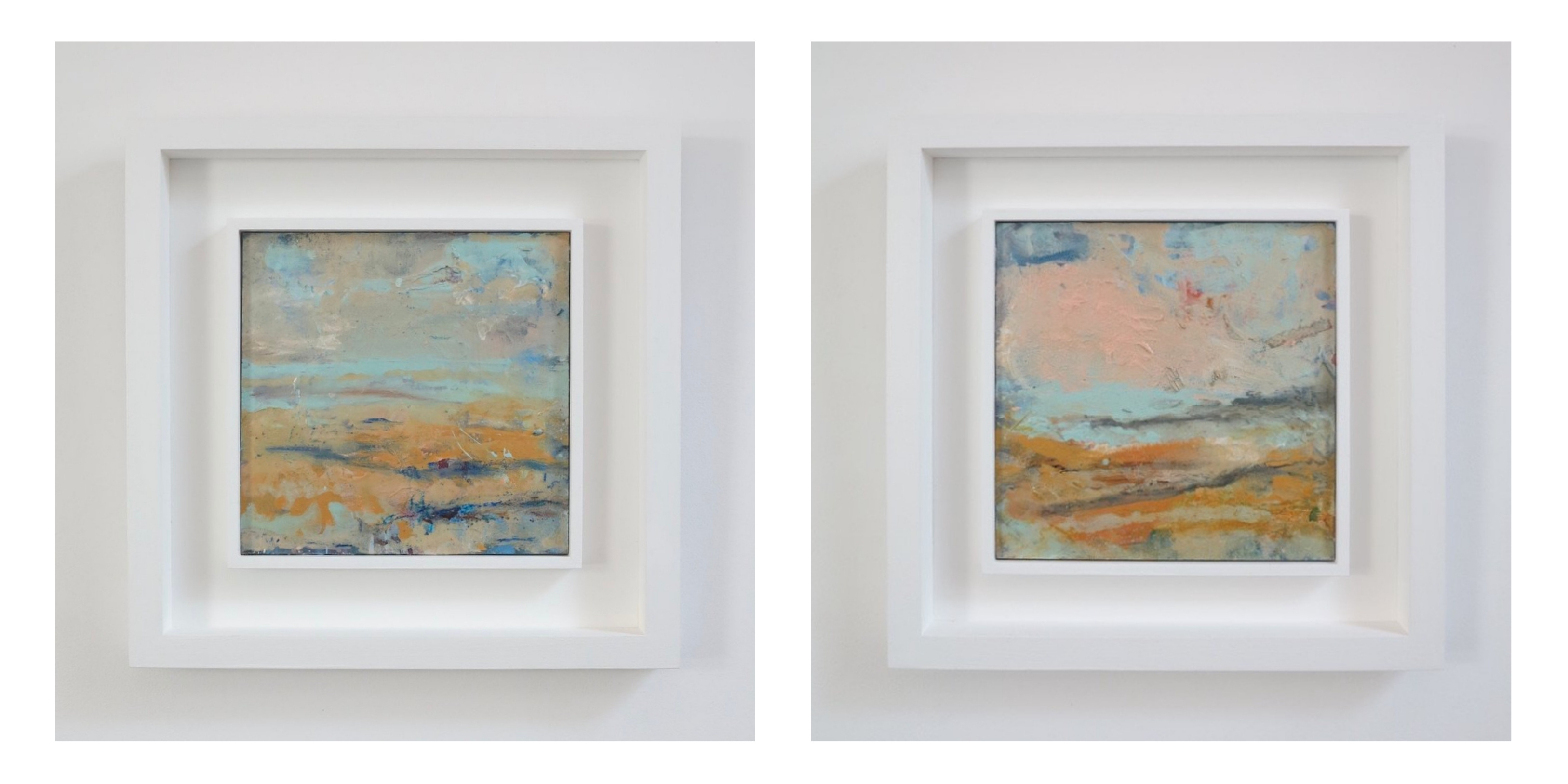 (L‑R): Living Waters No.1 and Living Waters No.4, mixed media on artist board, 20.5 x 20.5 cm, framed size 36 x 36 cm. Copyright © 2025 Jon White.